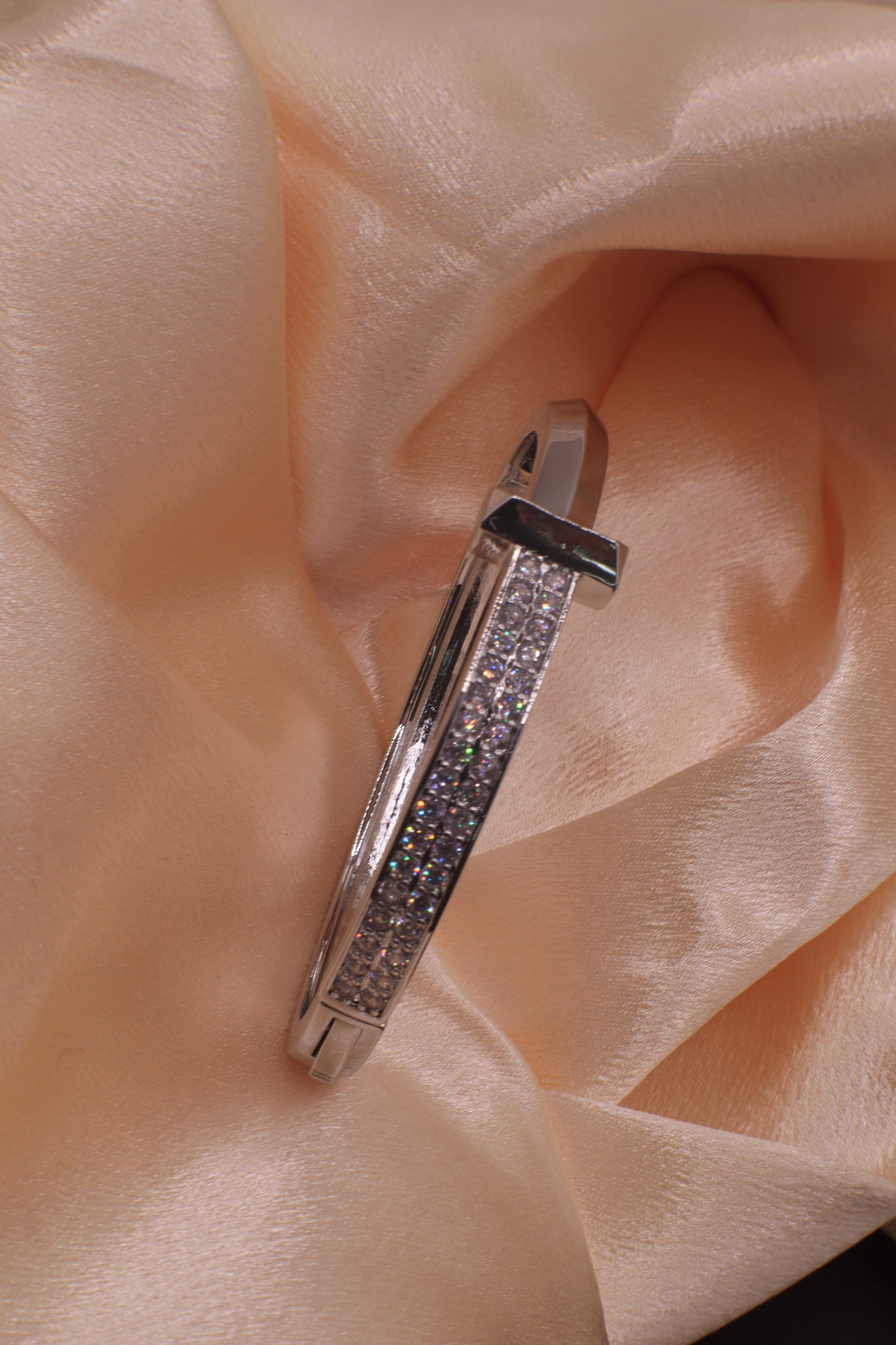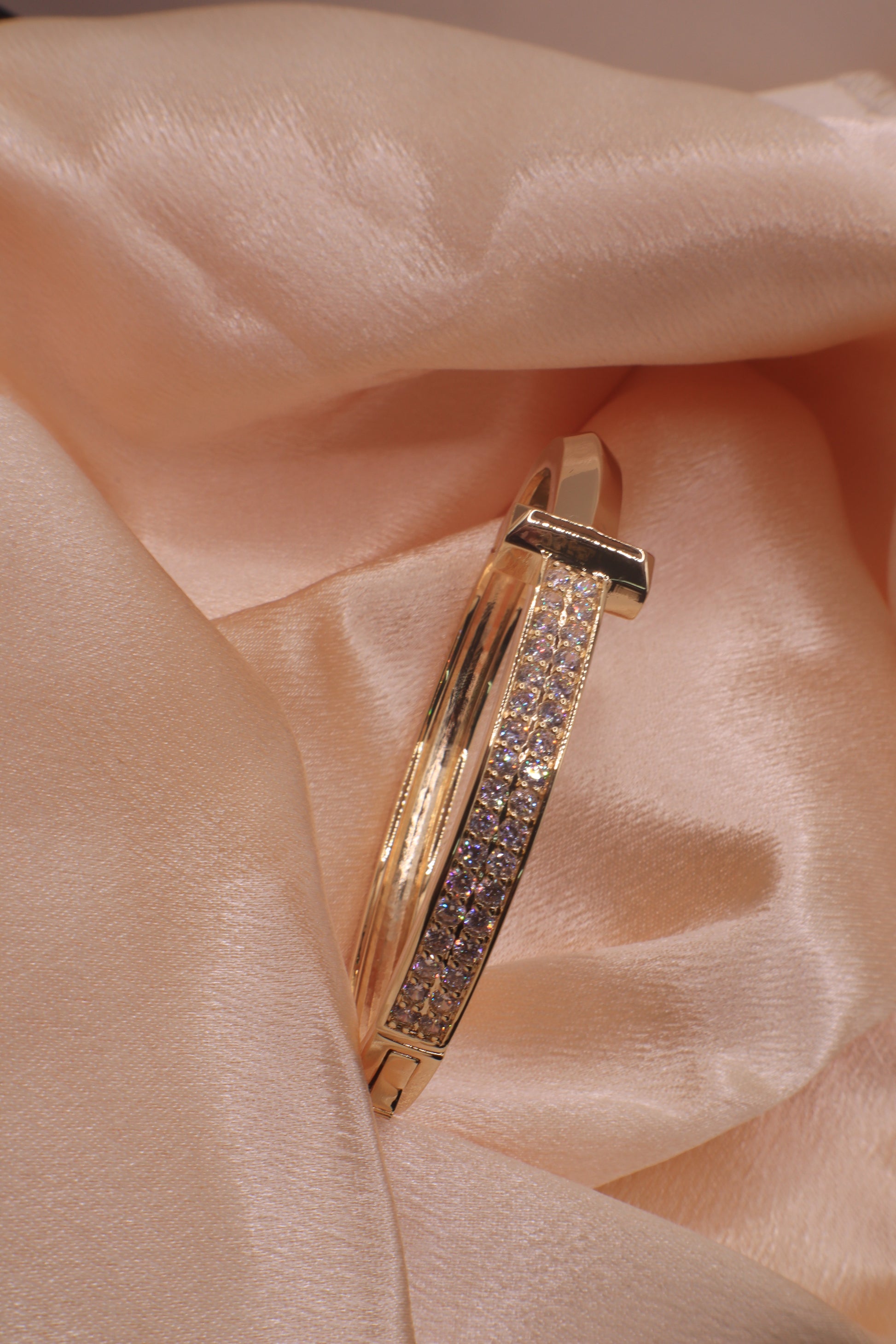 This T zirconia bangle sparkles and shines with its precision-cut stones, adding a touch of elegance to any outfit. Made with high-quality materials, this bangle is durable and long-lasting, perfect for daily wear. Add it to your jewelry collection for a timeless and sophisticated look. Introducing the T zircon Stoned Bangle. Made with hypoallergenic materials and plated in gold, this bangle is not only stylish but also tarnish-free. Perfect for those with sensitivity to traditional jewelry materials.